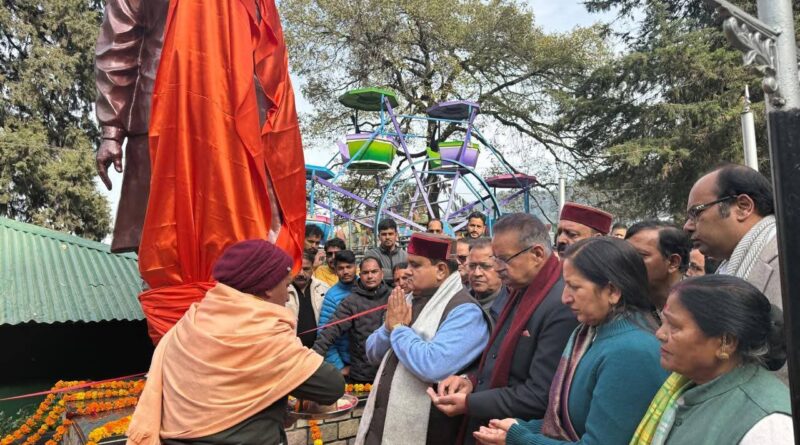 मसूरी स्थित अटल उद्यान में स्व. अटल बिहारी वाजपेयी की मूर्ति का लोकार्पण करते भाजपा प्रदेश अध्यक्ष महेंद्र भट्ट एवं कैबिनेट मंत्री गणेश जोशी