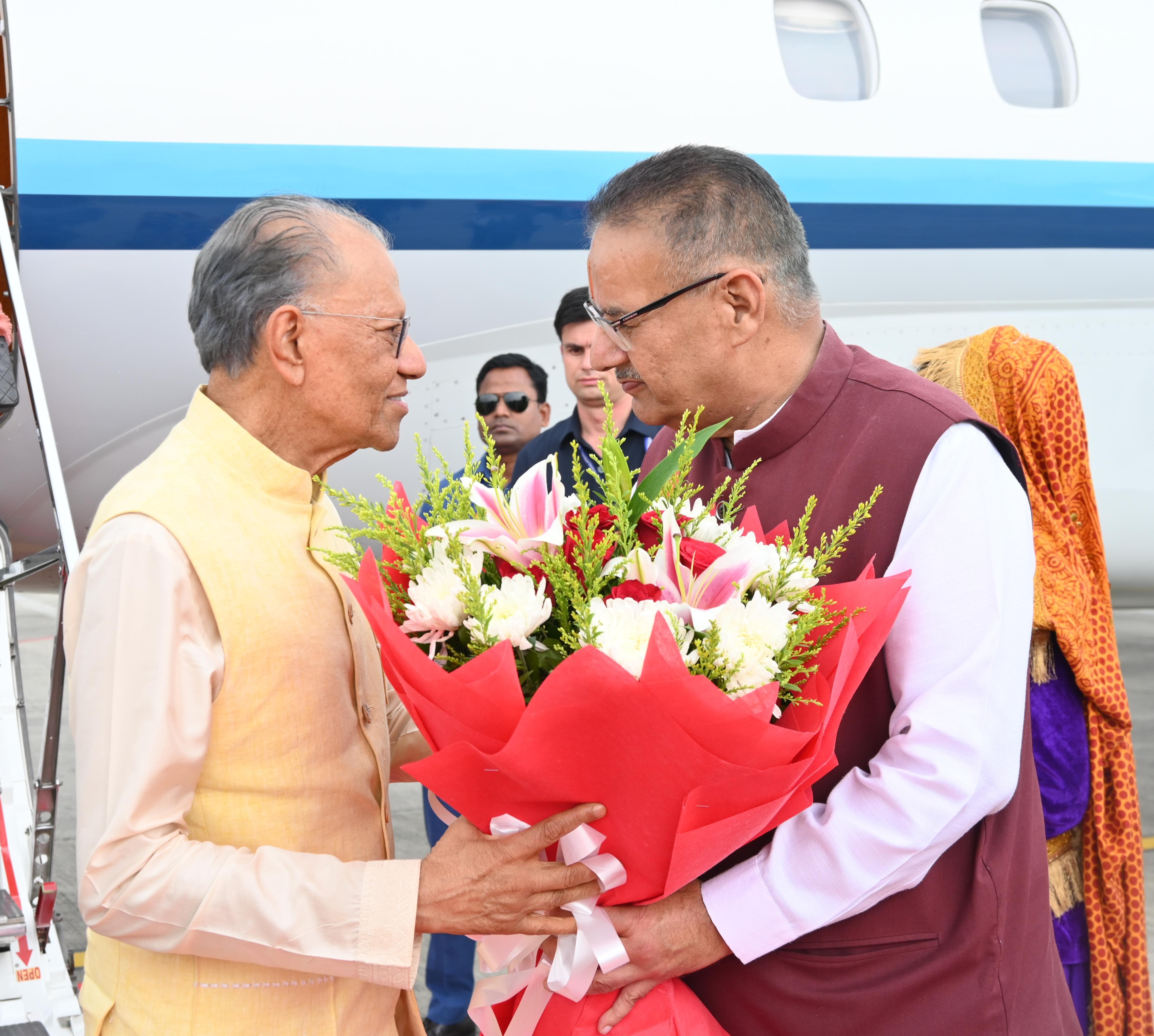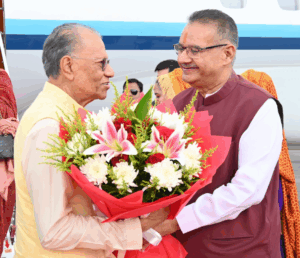 जॉलीग्रांट एयर पोर्ट पर मॉरीशस के प्रधानमंत्री का पुष्पगुच्छ भेंट कर उनका स्वागत करते कैबिनेट मंत्री गणेश जोशी