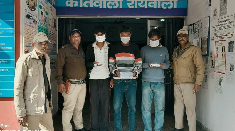 उक्त आदेशों के अनुपालन में कोतवाली रायवाला पुलिस टीम द्वारा दिनांक 08/12/2025 की रात्रि चैकिंग के दौरान अलग-अलग स्थानों से 03 नशा तस्करों 1- फुजैल पुत्र जिशान 2- वसीम पुत्र मौ0 आदिल तथा 3- अजय उर्फ मोनू पुत्र शमशेर को अवैध मादक पदार्थो के साथ गिरफ्तार किया गया। अभियुक्त फुजैल के कब्जे से 13.30 ग्राम अवैध स्मैक , वसीम के कब्जे से 18.64 ग्राम अवैध स्मैक तथा अजय उर्फ मोनू के कब्जे से 158 ग्राम अवैध चरस बरामद हुई। अभियुक्त फ़ुजैल तथा वसीम blinkit कंपनी में डिलीवरी बॉय का काम करते है, जो घरेलू सामान की डिलीवरी की आड़ में मादक पदार्थों की डिलीवरी कर रहे थे। तीनों अभियुक्तों के विरुद्ध कोतवाली रायवाला में एनडीपीएस एक्ट के तहत अलग-अलग अभियोग पंजीकृत किए गए।