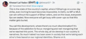 दिल्ली में पुलिस कांस्टेबल के द्वारा बिहार के 2 युवकों को गोली मारने का मामला गरमाता जा रहा है।इस मामले में अब खेसारी लाल यादव का बेहद तल्ख बयान आया है। उन्होंने सोशल मीडिया पर पोस्ट लिखकर सरकार, व्यवस्था और नेताओं पर हमला बोला है।