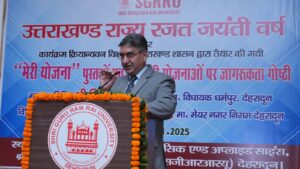 देहरादून। उत्तराखण्ड राज्य स्थापना दिवस के अवसर पर शुक्रवार को श्री गुरु राम राय विश्वविद्यालय में एक विशेष कार्यक्रम का आयोजन किया गया। कार्यक्रम क्रियान्वयन विभाग, उत्तराखण्ड शासन द्वारा “मेरी योजना” पुस्तकों के सम्बन्ध में एक जागरूकता गोष्ठी आयोजित की गई। इस गोष्ठी का उद्देश्य विद्यार्थियों एवं नागरिकों को राज्य व केन्द्र सरकार की योजनाओं की जानकारी देना था।